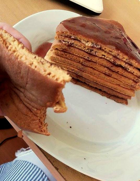 Pré aquecer uma frigideira a lume 6 com ou sem óleo de coco (fica ao critério de cada um, e se a frigideira for de qualidade não é necessário adicionar nenhuma gordura). Fazer as panquecas do tamanho que preferir.