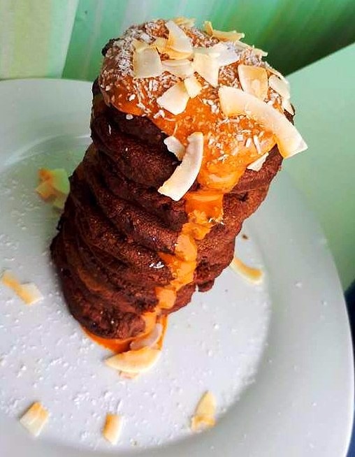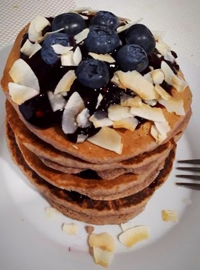 Pré aquecer uma frigideira a lume 6 com ou sem óleo de coco (fica ao critério de cada um, e se a frigideira for de qualidade não é necessário adicionar nenhuma gordura). E fazer as panquecas do tamanho que preferir.