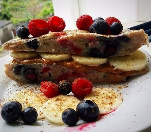 Colocar metade da massa na frigideira, e adicionar os mirtilos e framboesa por cima da massa, cobrir com a restante massa, e tapar com uma tampa de um tacho. Quando estiver pronto virar o "pão" e pode destapar a frigideira e deixar cozinhar.