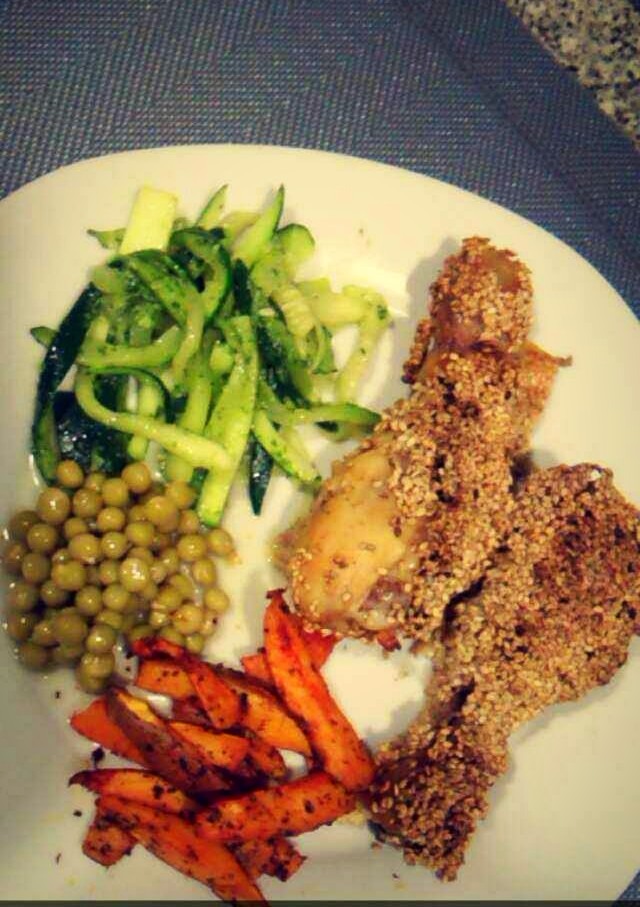 Temperar o frango com limão, pimenta branca, alho, cebola em pó. Bater um ovo num prato de sopa, e colocar as sementes de sésamo noutro prato de sopa. Depois molhar as pernas de frango no ovo, e de seguida nas sementes. Pré aquecer o forno a 180ºC e durante 35minutos até estarem cozidas.