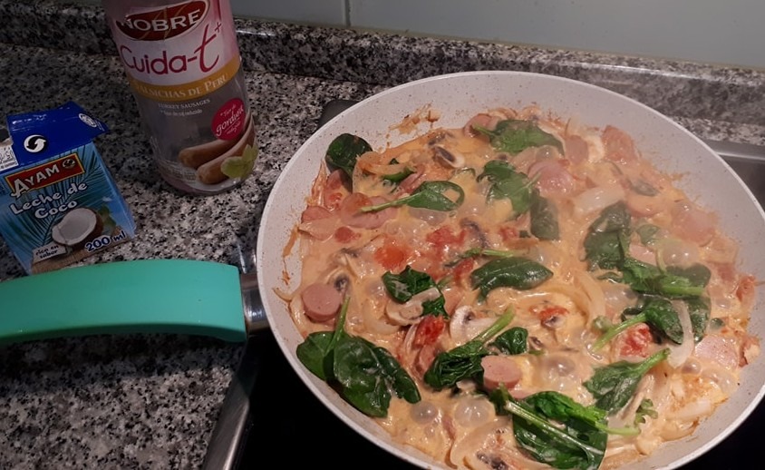 Adicionar o tomate pelado, os espinafres, as especiarias, e o leite de côco e deixar refogar. Acrescentar as salsichas e os cogumelos e deixar aporar.